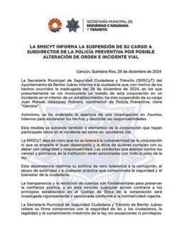 Suspenden al subdirector de la policía de Cancún, Juan Velázquez Robledo, por alterar el orden público en un bar y causar un accidente, presuntamente alcoholizado: SMSCyT / Taxistas del sindicato “Andrés Quintana Roo” se envalentonan y en un video publicado en redes sociales aseguran que no les retirarán las concesiones / Cierra Q. Roo como líder peninsular en violencia intrafamiliar: SNVE