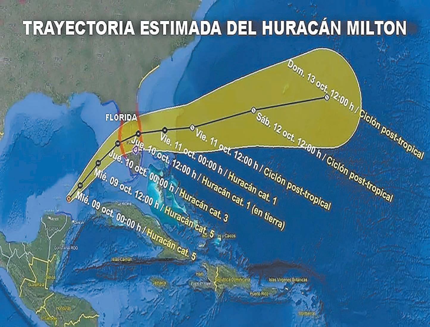 WASHINGTON.- El Huracán Milton recuperó fuerza ayer y se convirtió en una tormenta de categoría 5 con vientos máximos sostenidos de 270 kilómetros por hora, mientras avanza lento hacia el estado de Florida, según el Centro Nacional de Huracanes (NHC) de Estados Unidos.