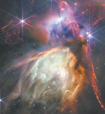 La Administración Nacional para la Aeronautica y el Espacio (NASA, por sus siglas en inglés) difundió una imagen nueva y sorprendente sobre el nacimiento de estrellas similares al Sol en la que se ven chorros de gas rojo que estallan en el cosmos y polvo incandescente, lo cual coincide con el primer aniversario de operaciones del telescopio James Webb. Provienen de la región de formación estelar más cercana a la Tierra, a 390 años luz, situada en la nube de gas Rho Ophiuchi La imagen contiene unas 50 estrellas jóvenes de tamaño simi-
