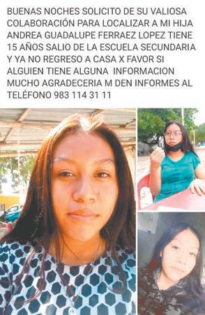 Protesta la familia de Fernanda Canul frente a la FGE en Cancún, a nueve meses de la desaparición de la niña; el único detenido por el hecho no ha dado su declaración / Hallan con vida en Huapix a 3 hombres que tenían fichas de búsqueda; fueron torturados. En Benito Juárez, matan a un hombre en la Sm 251 / Llega AMLO a Chetumal, donde iniciará su sexta gira en el año para supervisar el Tren Maya Policía 22, 23 y 24 / Ciudad 13