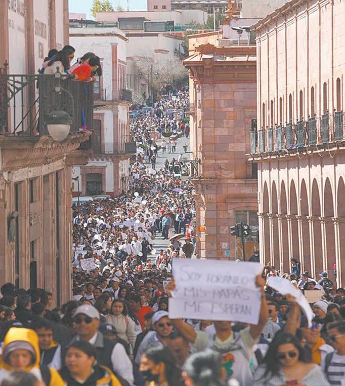 El contingente de universitarios, vestidos de blanco, con pancartas y lonas con las leyendas: “Queremos paz” y “No queremos ser los siguientes”, salió de la explanada de la escuela de Ingeniería para recorrer parte del bulevar Eje Metropolitano y entrar al Centro Histórico de la capital zacatecana por las avenidas González Ortega e Hidalgo