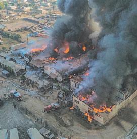 cladora y una empresa de cartón. El siniestro comenzó a las aproximadamente a las 6:45 de ayer, y un total de 50 bomberos de 10 estaciones diferentes acu-