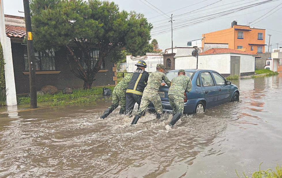PACHUCA, Hgo.- Elementos de la 18 Zona Militar aplicaron el Plan DNIII-E en Pachuca, Hidalgo, ante las fuertes lluvias que se registraron, lo que ocasionó el colapso del sistema de drenaje, que afectó varias colonias, por lo cual los automovilistas que quedaron varados tuvieron que ser rescatados.