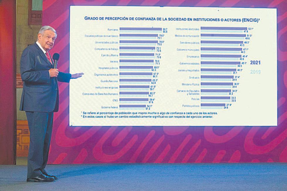 CIUDAD DE MÉXICO.- El presidente Andrés Manuel López Obrador destacó el aumento de la confianza de la población en las secretarías de Marina y de la Defensa Nacional, así como la Guardia Nacional; entre marzo y abril de 2023 el porcentaje fue superior al 90 por ciento e incluso incrementó con relación a 2022, de acuerdo con el Instituto Nacional de Estadística y Geografía (INEGI).