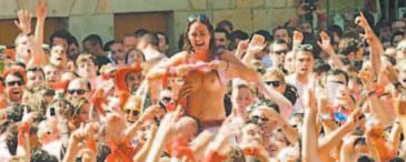 Casi todos, incluidos muchos turistas, llevaban la vestimenta tradicional de pantalón y camisa blanca con una faja y pañuelo rojo. Al dispararse el cohete, muchos arrojaron vino tinto o espumante a sus vecinos.