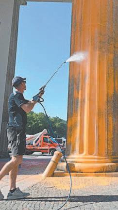 BERLÍN.- Activistas climáticos alemanes rociaron pintura naranja en la Puerta de Brandeburgo de Berlín ayer por la mañana para instar al Gobierno alemán a tomar medidas más urgentes contra el cambio climático.