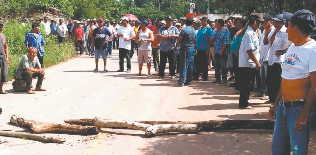 LOS comuneros se apostaron en el camino, el cual cerraron con troncos y piedras ante el incumplimiento de la liquidación que falta de los 11 millones 383 mil pesos en total, por el daño a sus terrenos, al construirse la obra hace varias décadas.- (Justino Xiu)
