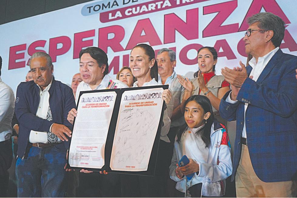 choacán, Alfredo Ramírez Bedolla; Gerardo Fernández Noroña, coordinador de vocerías; Ricardo Monreal, coordinador territorial, y Manuel Velasco, excorcholata presidencial. Por su parte, Mario Delgado Carrillo, líder nacional de Morena, detalló que se firmará en cada Estado el Acuerdo por la Unidad, junto con el Partido del Trabajo (PT) y Partido Verde Ecologista de México (PVEM), el cual llama a la población para que se sumen a la regeneración del país y aclaró que “aquí cabemos todos”, sin importar profesión, creencias o afiliación partidista. (Redacción POR ESTO!)