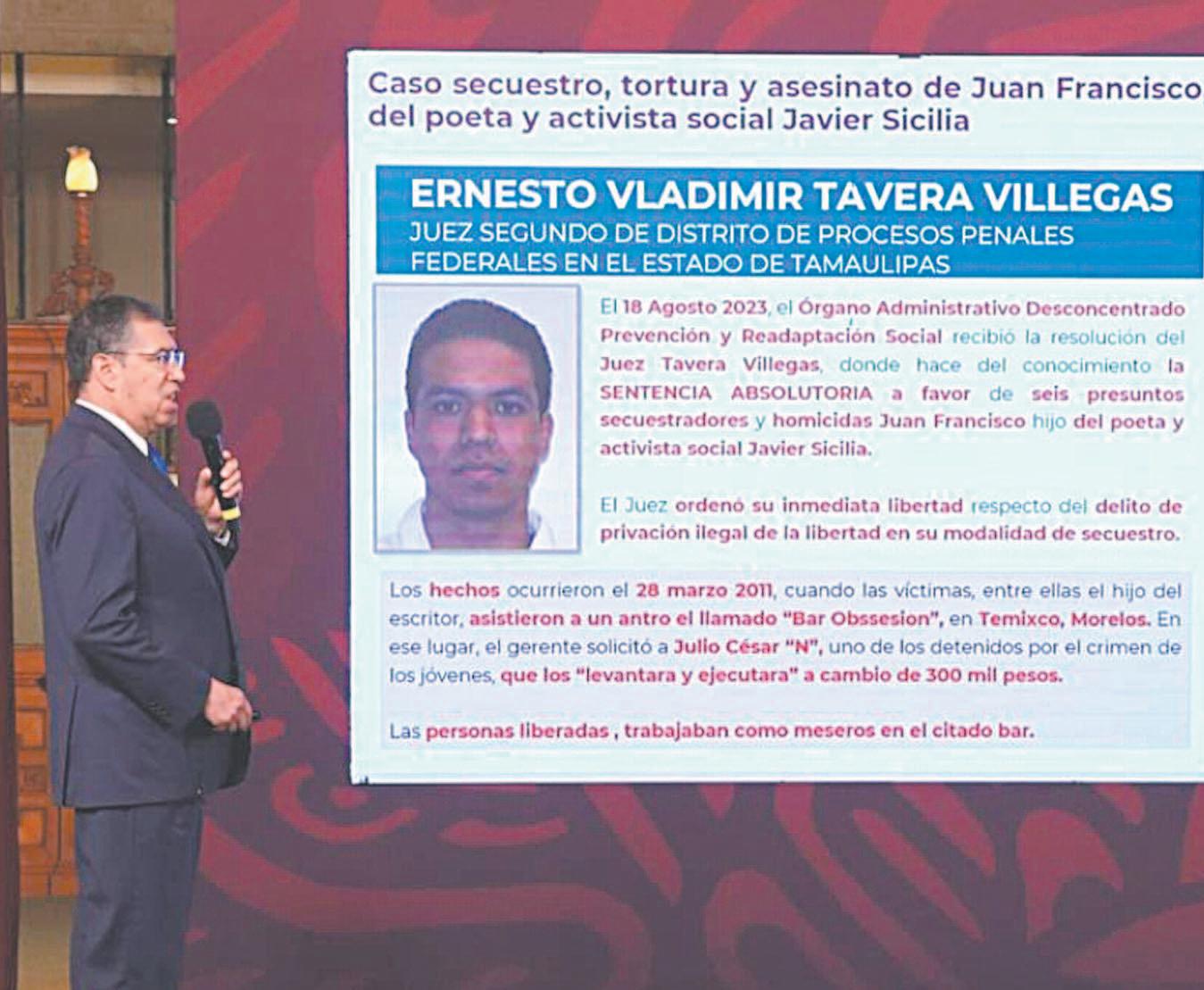 Aspirantes del Frente Amplio por México compartieron ideas. (POR ESTO!) Patricia María Menéndez Cámara Sergio Rugerio Palacios Mario Renato Menéndez Rodríguez Fundador y Director Honorario Alicia Menéndez Figueroa Directora GeneralAyer, durante la conferencia matutina del presidente Andrés Manuel López Obrador, Luis Rodríguez Bucio, subsecretario de Seguridad Pública, denunció a un grupo de 26 jueces y magistrados por presuntamente beneficiar a delincuentes, incluyendo casos como la liberación de implicados en el secuestro y asesinato del hijo de Javier Sicilia. El subsecretario señaló a Ernesto Vladimir Tavera Villegas, juez segundo de distrito de proceso penales en Tamaulipas, por dictar sentencia absolutoria de seis presuntos secuestradores y homicidas del hijo del poeta Sicilia. Siendo que otros seis implicados fueron sentenciados a prisión por entre 10 y 60 años.