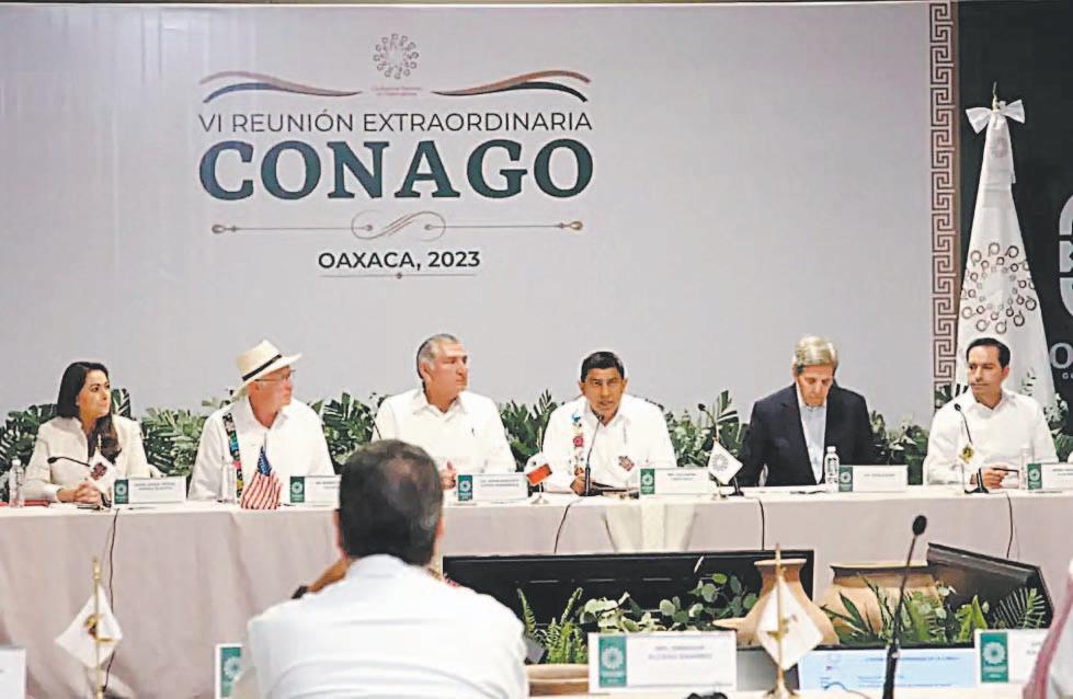 INTEGRANTES de la Conago y el secretario de Gobernación, Adán Augusto López, recibieron en Oaxaca al embajador Ken Salazar y al enviado especial de la Casa Blanca para el clima, John Kerry.- (Cuartoscuro)