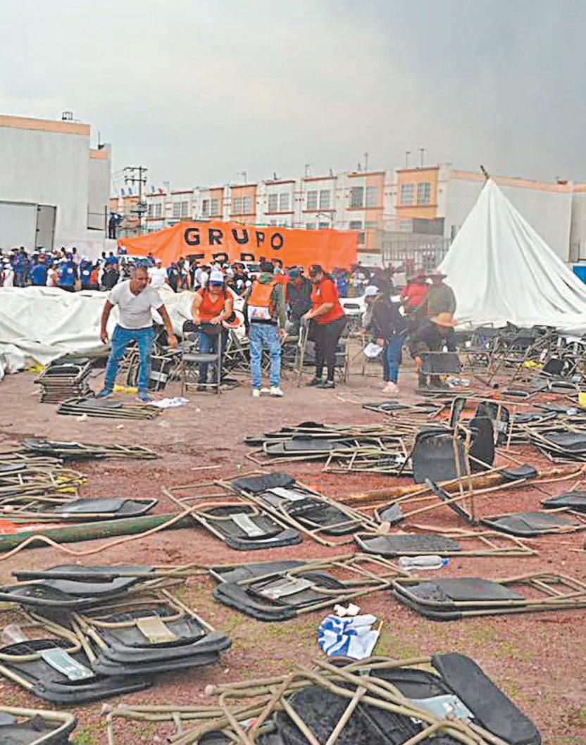 CIUDAD DE MÉXICO.- Durante un mitin de Alejandra del Moral Vela, candidata a la gubernatura del Estado de México, realizado en el municipio de Tecámac, los fuertes vientos provocaron un accidente que alarmó a los simpatizantes que acudieron al evento político para escuchar a la representante de la coalición Va por el Estado de México, formada por del PAN, PRI, PRD y Nueva Alianza, y dejó un saldo de una persona muerta y 26 lesionadas