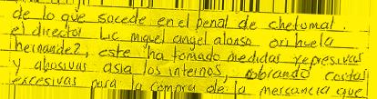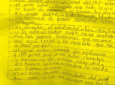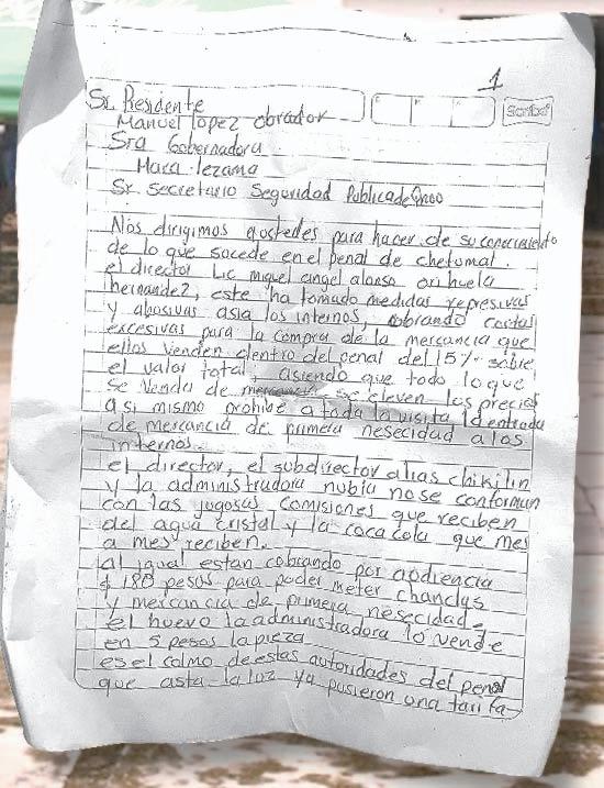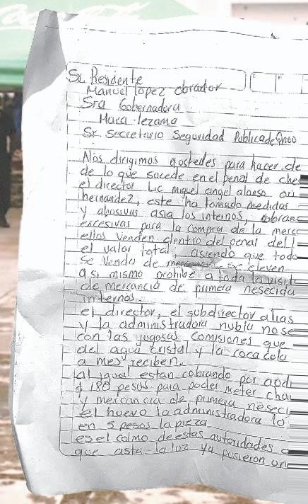 A través de una carta dirigida al Presidente de México, dada a conocer por los familiares de los presos, expusieron que también hay dos reos que pretenden instalar un autogobierno, y que inclusive, uno ya abrió una frutería adentro del penal.- (POR ESTO!)
