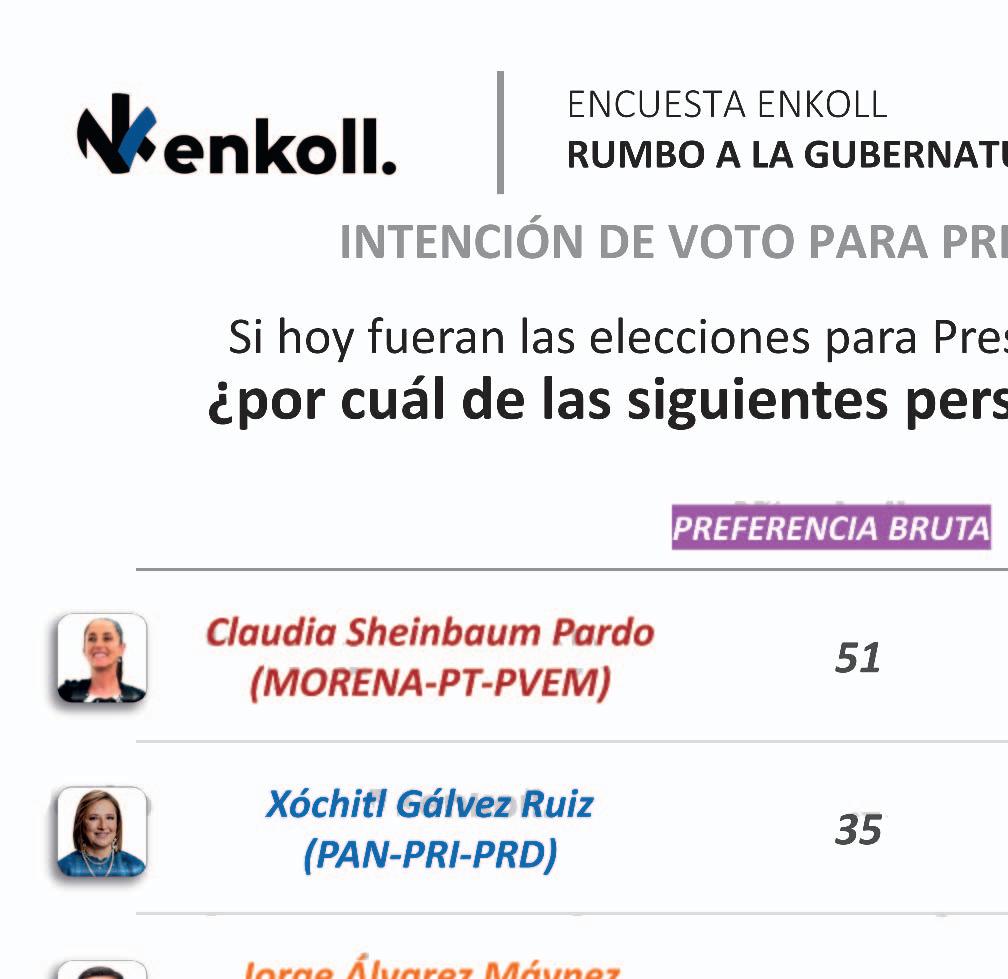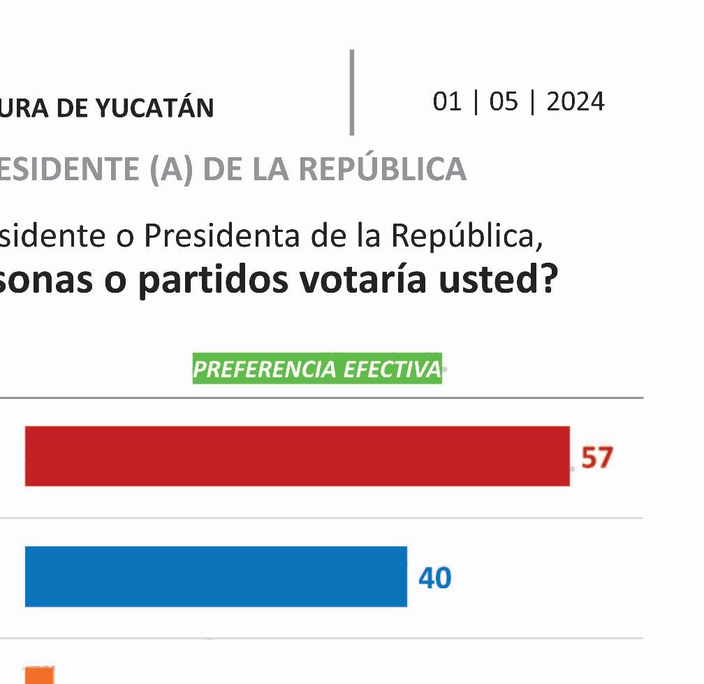 Las cifras lo sustentan. La más reciente encuesta elaborada por Enkoll, difundida ayer 1 de mayo, no deja duda de lo que sería un carro completo para la 4T. Según el estudio, aplicado entre la población yucateca, la candidata presidencial de Sigamos Haciendo Historia, Claudia Sheinbaum Pardo, lleva una ventaja de 17 puntos porcentuales de diferencia efectiva y de 16 en la preferencia bruta por encima de la candidata de Fuerza y Corazón por México, Xóchitl Gálvez Ruiz. A su vez, Jorge Álvarez Máynez, de Movimiento Ciudadano, tiene apenas 2 y 3 de preferencia bruta y efectiva, respectivamente. Desde el inicio de la jornada de proselitismo, Sheinbaum se ha mantenido al frente de todas las encuestas aplicadas en el país. Luego de su participación en dos debates, en los que tuvo que enfrentar los ataques de su adversaria de Fuerza y Corazón por México, sigue con paso firme hacia el Palacio Nacional. De igual forma, la encuestadora Enkoll vaticina que en el Gobierno del Estado de Yucatán habría un cambio histórico, en una posición en la que siempre se alternaron el PAN y el PRI. Ahora, entraría una nueva ideología, con Joaquín Díaz Mena. Huacho, revela la encuesta difundida ayer, tiene una ventaja del 5%, pues cuenta con 48 puntos en preferencia bruta y un 51% en preferencia efectiva, frente a un 43 y 46 puntos, respectivamente, de Renán Barrera Concha. (Redacción POR ESTO!)