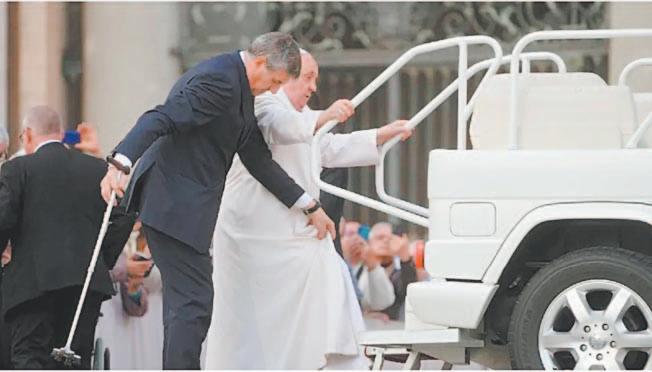 Sin embargo, ayer, Francisco pareció no poder subirse al papamóvil al final de su audiencia, ni siquiera sujetándose de las manillas. Sus asistentes rápidamente le acercaron la silla de ruedas y el Papa se sentó. Saludó a la multitud antes de ser sacado de la Plaza.