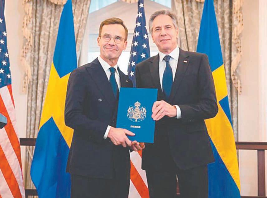 El primer ministro sueco, Ulf Kristersson, y el secretario de Estado de Estados Unidos, Antony Blinken, presidieron una ceremonia en la que se depositó oficialmente en el Departamento de Estado el “instrumento de adhesión” de Suecia a la Alianza.