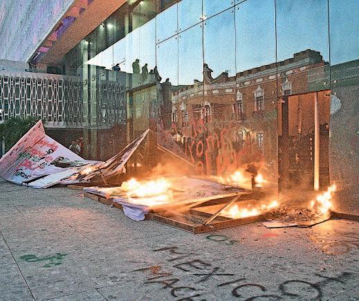 En videos compartidos se puede ver a las mujeres alrededor del fuego, sobre todo alrededor del Palacio Nacional, donde además pintaron las vallas protectoras con frases como “protegen más a los monumentos que a las mujeres”.