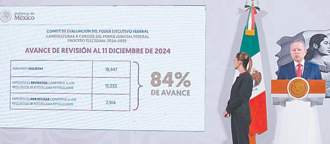 CIUDAD DE MÉXICO.- El proceso de selección de aspirantes del Comité de Evaluación del Poder Ejecutivo presentó hasta ayer un avance del 84% en la revisión de los requisitos de las 18 mil 447 personas que se inscribieron en la convocatoria para aspirar a una candidatura para la elección de jueces, magistrados y ministros, que se llevará a cabo el 1 de junio de 2025, informó el coordinador general de Política y Gobierno de la Presidencia de la República, Arturo Zaldívar Lelo de Larrea.