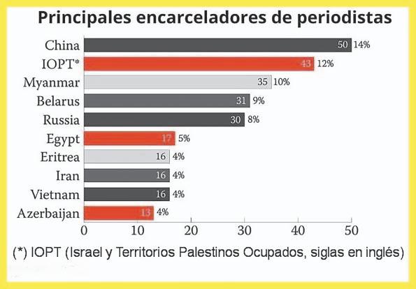China, Israel y Birmania, con 50, 43 y 35 periodistas detenidos, respectivamente, “emergieron como los tres peores infractores del mundo en otro año récord para los periodistas encarcelados a causa de su trabajo”, dice el CPJ.