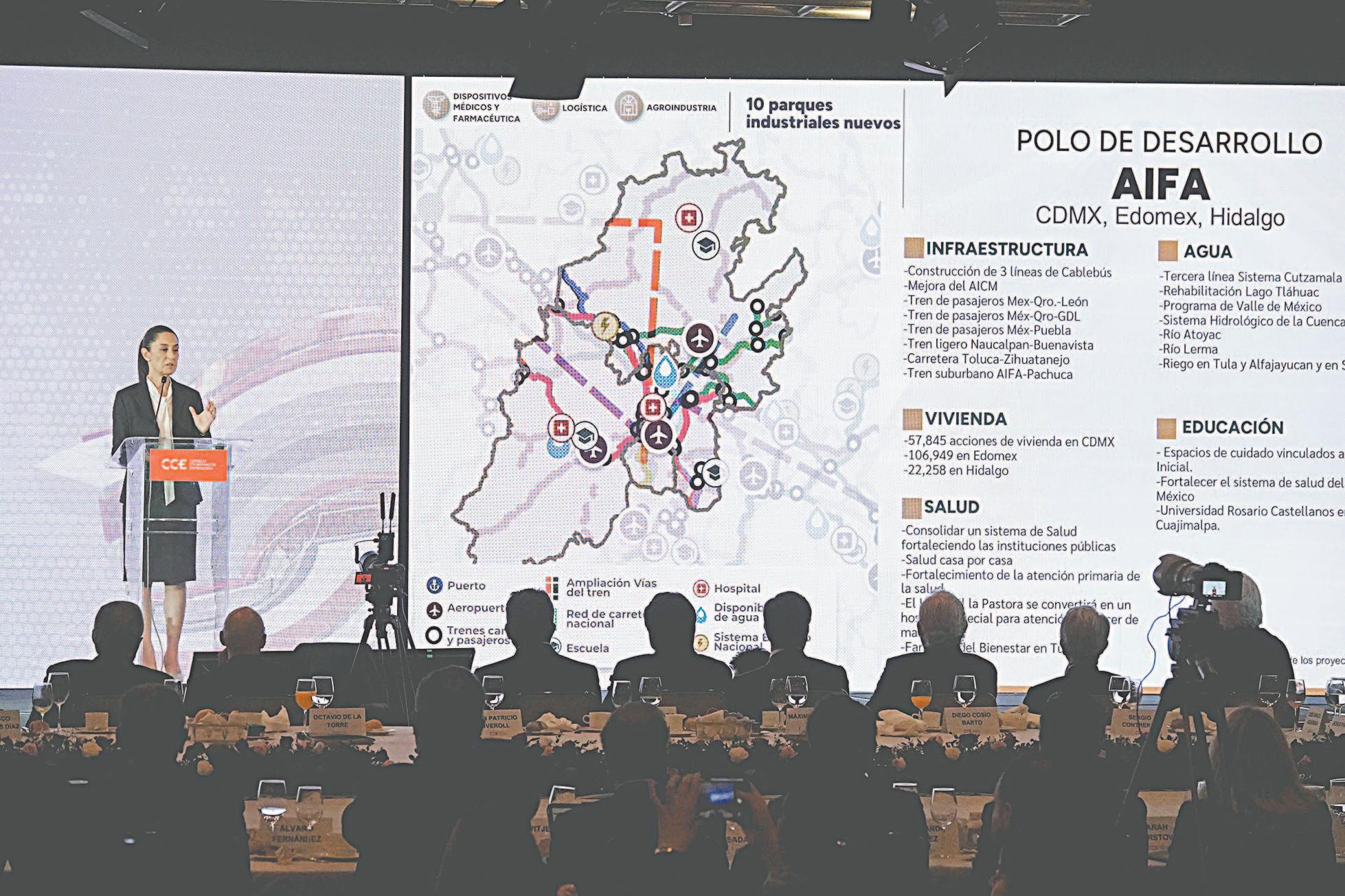 CLAUDIA SHEINBAUM PRESIDENTE DE MÉXICOPor otro lado, Sheinbaum pidió a los empresarios trabajar en la relocalización de empresas y polos del bienestar, haciendo énfasis en impulsar la zona del Aeropuerto Internacional Felipe Ángeles