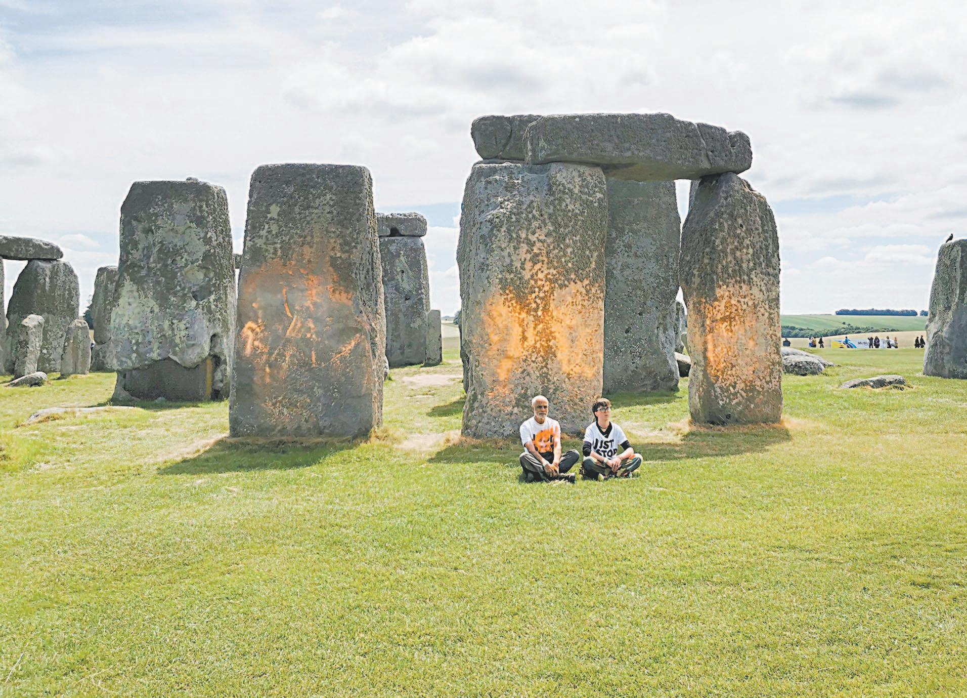 Dos manifestantes climáticos fueron detenidos ayer por rociar pintura naranja sobre el antiguo monumento de Stonehenge, en el Sur de Inglaterra.
