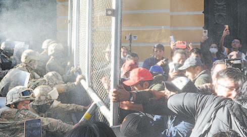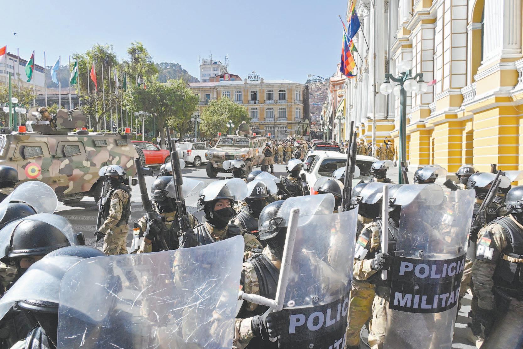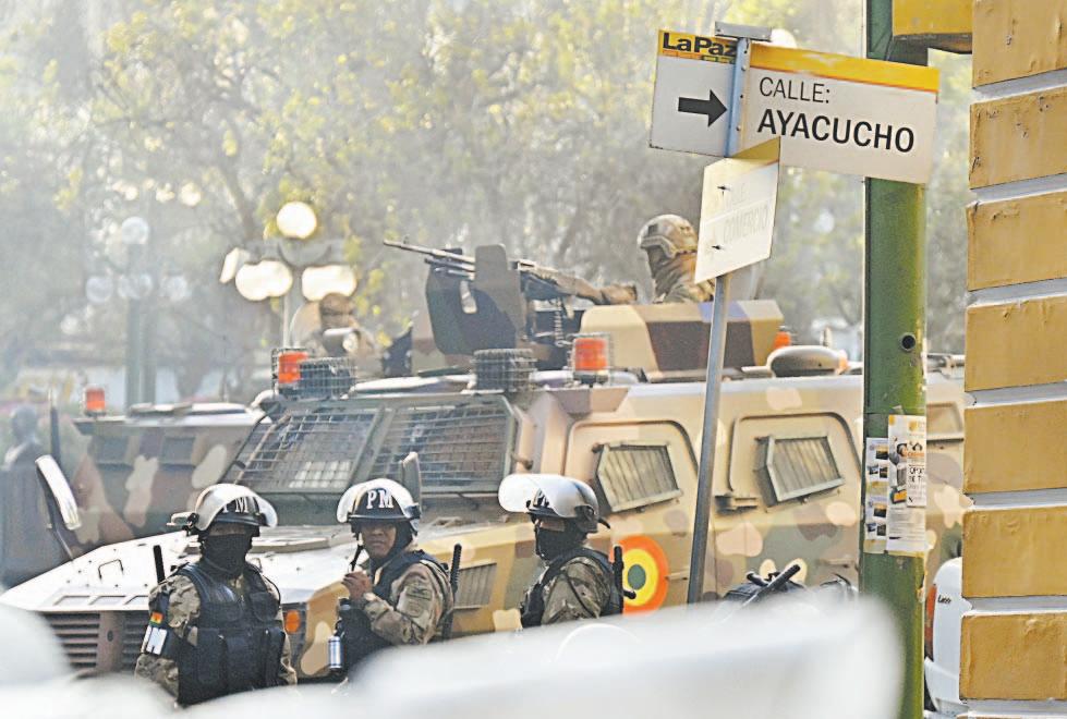 Con equipo táctico y armas de alto calibre, efectivos bolivianos rodearon la plaza frente al Palacio de Gobierno. Además, se reportó la presencia de francotiradores. Alrededor de las 15:50 hora local, un tanque tiró las puertas de la sede del Ejecutivo de Bolivia y elementos del Ejército accedieron al recinto.