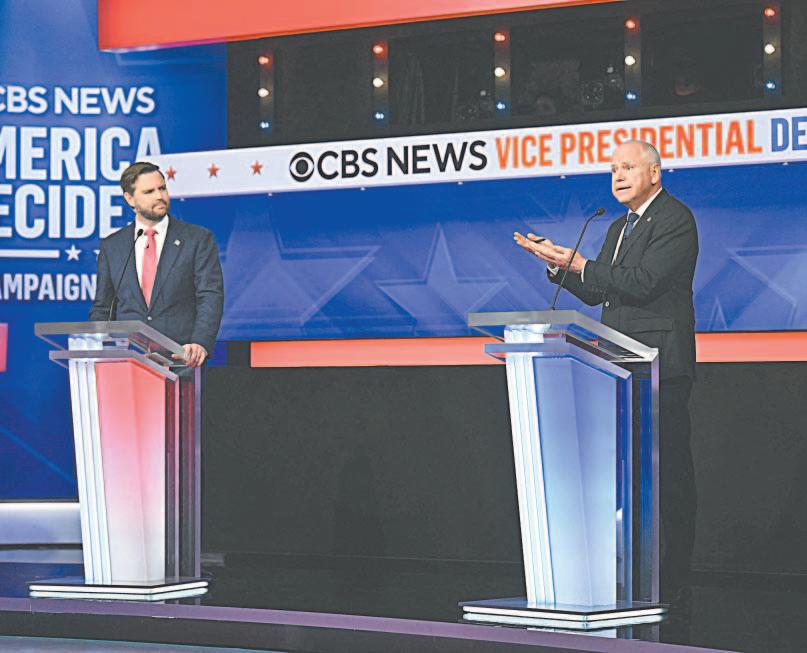 Vance acusó a los demócratas de ser “proaborto radicales”. “No, no lo somos, somos promujer. Estamos a favor de la libertad de que (las mujeres) hagan su propia elección”, respondió Walz. Las encuestas han mostrado que la vicepresidenta Kamala Harris y el expresidente Donald Trump están enfrascados en una contienda reñida, lo que da más peso a todo lo que pueda infl uir en los votantes de los márgenes, incluida la impresión que causaron los candidatos a la vicepresidencia en álgido el encuentro. (Agencias)