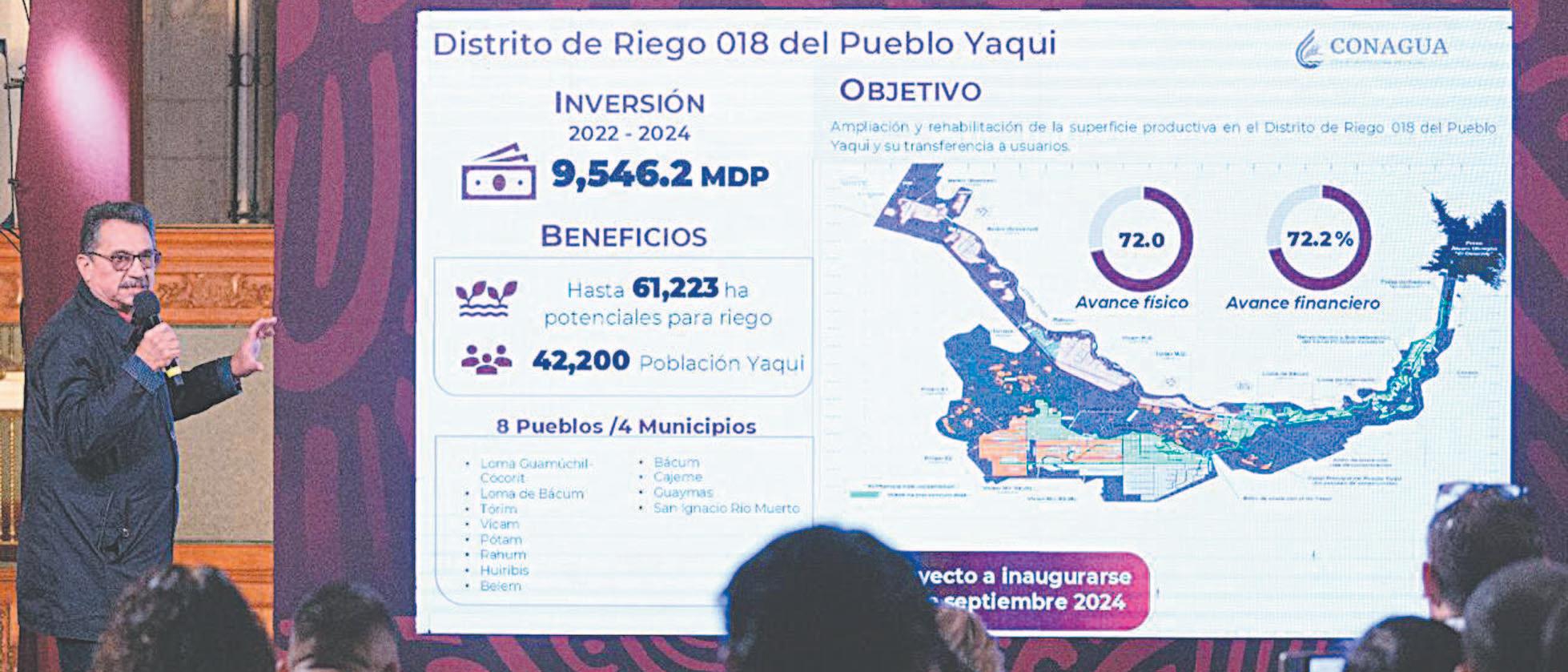 El responsable del Distrito de Riego 018 del Pueblo Yaqui, Aarón Mastache Mondragón, detalló que, durante el periodo 2022-2024, se destinó una inversión de 9 mil 546.2 millones de pesos para mejorar la infraestructura y aumentar la capacidad de riego en la región, en beneficio de los ocho pueblos yaquis (Loma Guamúchil-Cócorit, Loma de Bácum, Tórim, Vícam, Pótam, Rahum, Huiribis y Belem).