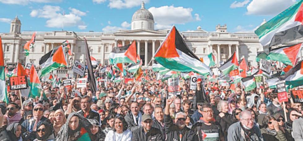 En Londres, el acto, organizado por la Campaña de Solidaridad con Palestina, comenzó en Russell Square, en el centro de la ciudad, antes de que los asistentes marcharan a Trafalgar Square para una concentración a media tarde.