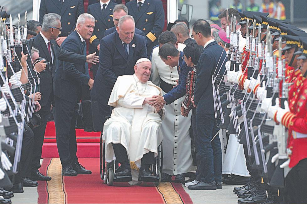 El Pontífi ce desembarcó en silla de ruedas y fue recibido en el aeródromo por el ministro de Asuntos Religiosos de Indonesia, Yaqut Cholil Qoumas, además de altos cargos indonesios, una Guardia de Honor, y niños que le entregaron fl ores. Reposaría el resto del día para descansar del vuelo y acostumbrarse a la diferencia horaria, indicó el Vaticano.