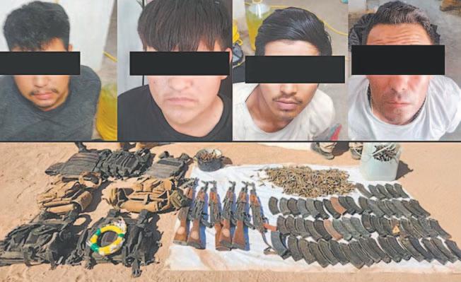 CABORCA, Sin.- Integrantes de la Mesa Estatal de Seguridad detuvieron a cuatro presuntos criminales, cuatro vehículos y un arsenal en el ejido El Diamante , municipio de Caborca, Sinaloa. En acciones coordinadas entre elementos de la Agencia Ministerial de Investigación Criminal (AMIC) y de la Secretaría de Marina (Semar), detuvieron a Jahanson “N”, de 42 años, originario de Culiacán, Sinaloa; a David “N”, de 26 años, originario de Sonoyta; Ernesto “N”, de 19 años, de Sonoyta; y Raúl “N”, de 18 años, de Puerto Peñasco, por el delito de portación de armas de fuego de uso exclusivo del Ejército y vehí-