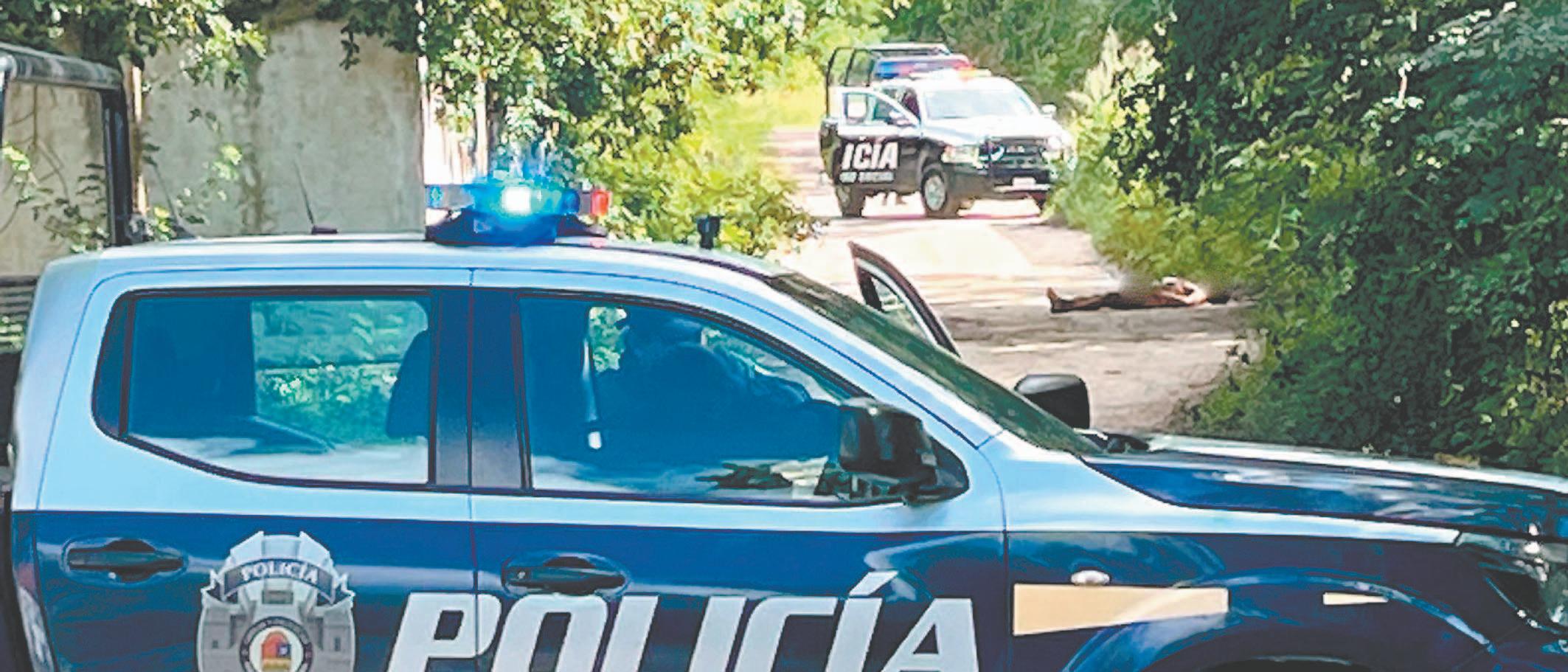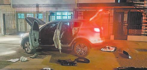 los cuerpos de dos personas y vehículos con impactos de bala.