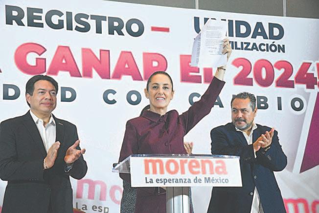 ante la mesa directiva del partido. Finalmente, pasadas las 18:00 horas, y entre gritos que la aclamaban “Presidenta”, la exjefa de gobierno de la Ciudad de México Claudia Sheinbaum acudió a registrarse como aspirante a ser la Coordinadora de la Defensa de la Transformación. Vestida completamente de guinda, la exmandataria local manifestó que confía en que habrá unidad durante el proceso de elección. (Redacción POR ESTO!)