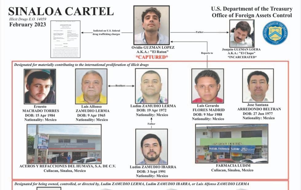 metanfetaminas y fentanilo”, afirmó el Departamento del Tesoro. Los precursores químicos se utilizan en súperlaboratorios “para producir fentanilo y metanfetamina ilícitos para el Cártel de Sinaloa”, añadió. Asimismo, desde Washington se sancionó a varios negocios propiedad de la familia Zamudio o vinculados a ella: Aceros y Refacciones del Humaya; Farmacia Ludim; Inmobiliaria del Río Humaya; Operadora Zait, Operadora del Humaya y Operadora Parque Alamedas.