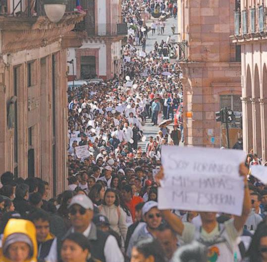 El contingente de universitarios, vestidos de blanco, con pancartas y lonas con las leyendas: “Queremos paz” y “No queremos ser los siguientes”, salió de la explanada de la escuela de Ingeniería para recorrer parte del bulevar Eje Metropolitano y entrar al Centro Histórico de la capital zacatecana por las avenidas González Ortega e Hidalgo