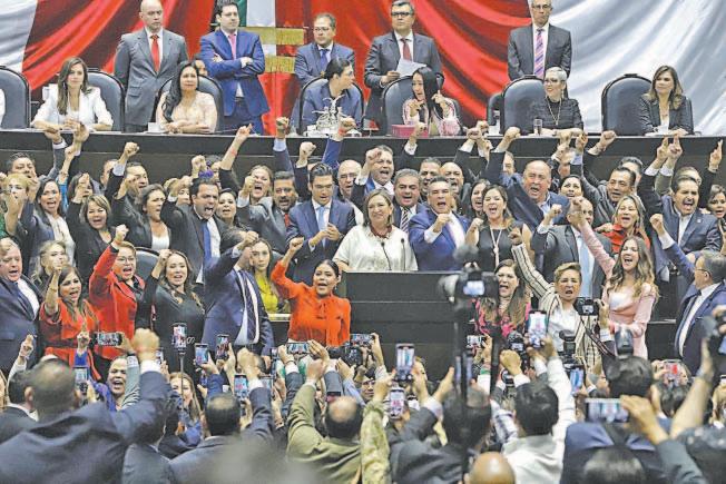rena, PT y PVEM y los de oposición. Primero, los diputados federales y senadores del PAN, PRI y PRD recibieron a Xóchitl Gálvez, virtual candidata presidencial del Frente Amplio por México (FAM), al grito de “¡Pre-si-denta!” a su llegada al salón de sesiones de la Cámara Baja.