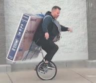 La acción resulta curiosa, pues el sujeto primero se amarra la gran caja a su espalda para después subir al monociclo y comenzar a pedalear rumbo a su destino. Evidentemente, la tarea no es nada sencilla, pues mantener el equilibrio sobre un monociclo ya es de por sí una tarea complicada, sumada al peso de la televisión y el tamaño de la caja, se le puede apreciar cómo avanza con gran dificultad.