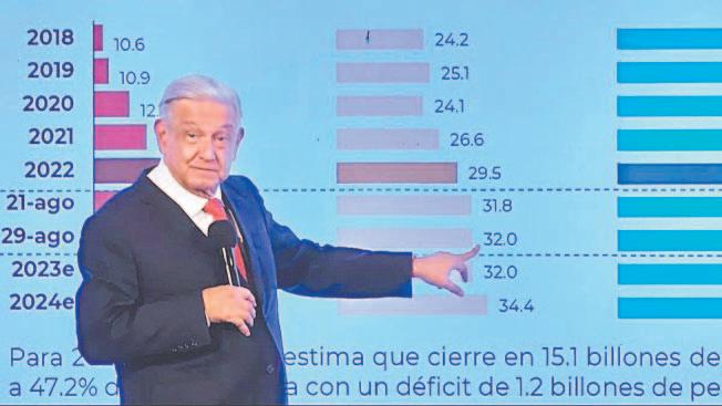 una deuda en términos nominales de 10.6 billones de pesos con un Producto Interno Bruto de 24.2 billones de pesos. Aseguró que, hasta el 29 de agosto de este año, la deuda está ubicada en 14.1 billones de pesos, con un PIB de 32 billones de pesos, como resultado del crecimiento económico en los últimos tres años.