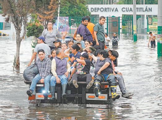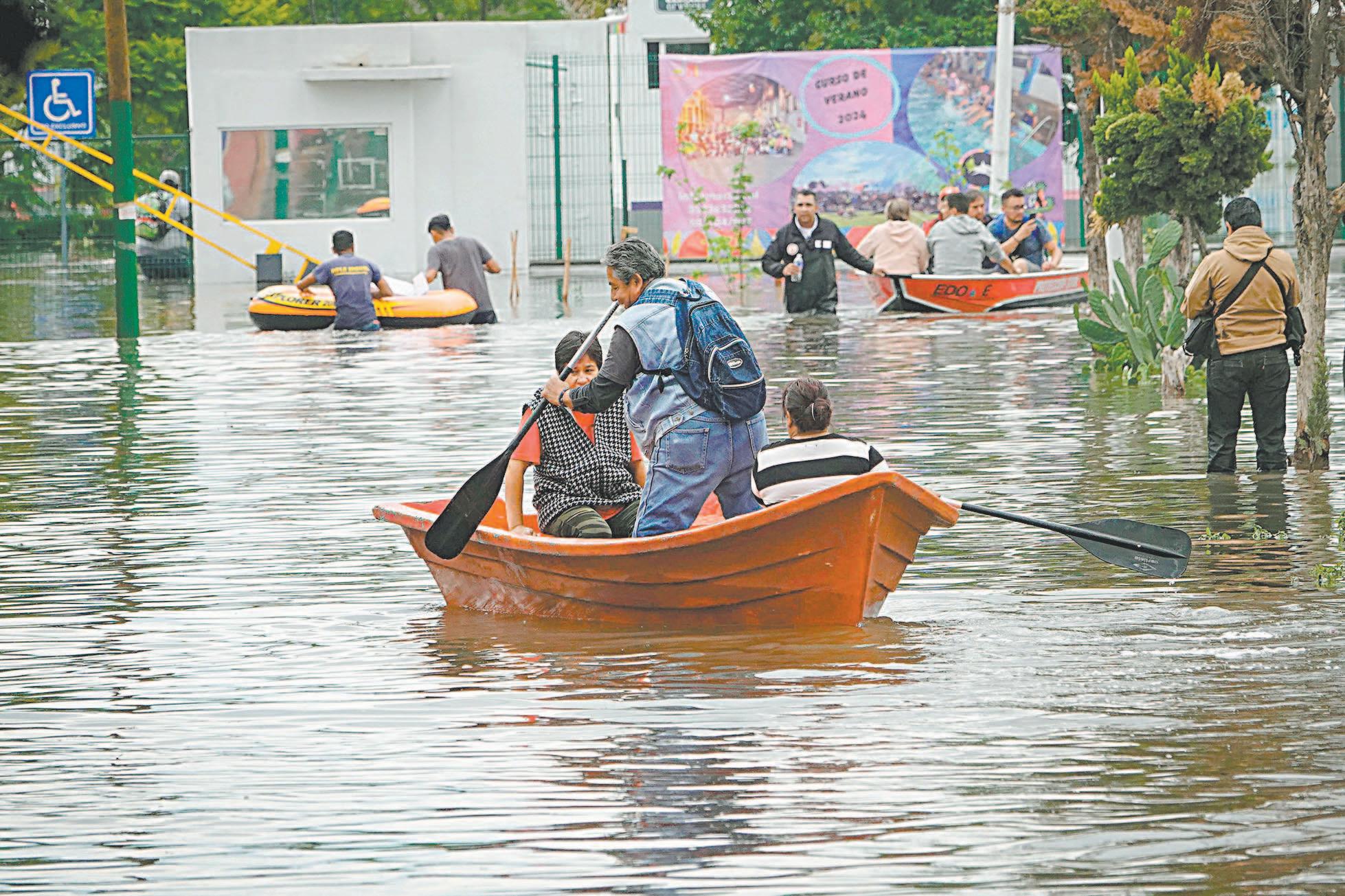 A bordo de lanchas es como personal de Protección Civil y Bomberos de Ecatepec y Cuautitlán Izcalli ayudan a vecinos de la colonia Rancho San Blas para poder salir de sus viviendas, en una zona que resultó mayormente afectada por el desbordamiento de un canal.