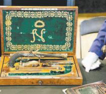 Las armas, , con incrustaciones de oro y plata que reproducen el perfil del emperador, se subastaron en su precioso estuche de madera (nogal, ébano, terciopelo verde bordado en oro, etc.) y con sus accesorios.