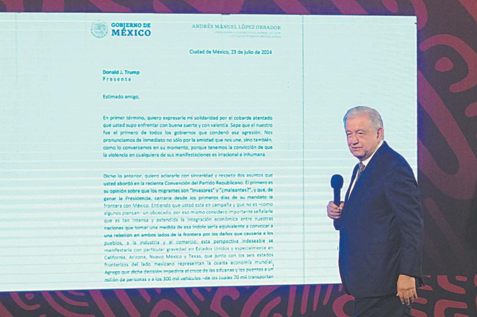 El presidente Andrés Manuel López Obrador presentó ayer la carta que enviará a Donald Trump, expresidente y candidato presidencial del Partido Republicano en Estados Unidos, en la que ratifica la defensa a los migrantes mexicanos y su contribución al desarrollo de ese país.