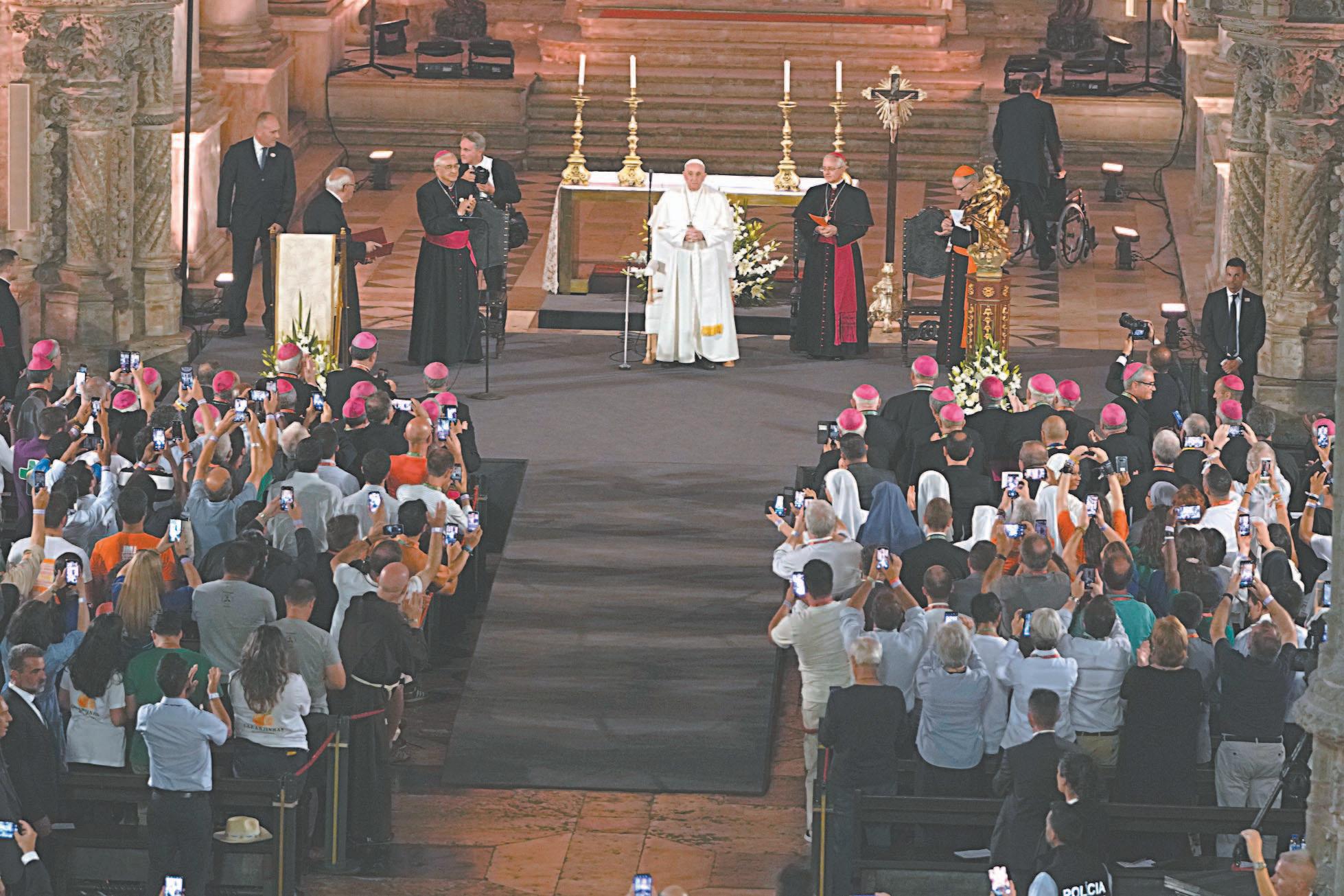 Por la tarde, Francisco acudió al Monasterio de los Jerónimos, junto al río Tajo, para encontrarse con representantes del clero de este país donde el 80 por ciento de sus 10 millones de habitantes se definen como católicos.