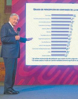 La Encuesta Nacional de Victimización sobre Seguridad Pública, publicada en 2023 por el INEGI, reporta que en el periodo referido, la Secretaría de Marina tuvo la mayor percepción de confianza con 90.1 por ciento; la Secretaría de la Defensa Nacional, 87.2 por ciento y la Guardia Nacional, 80.8 por ciento.