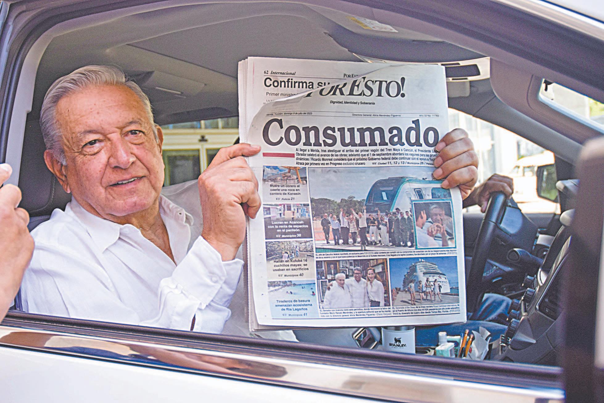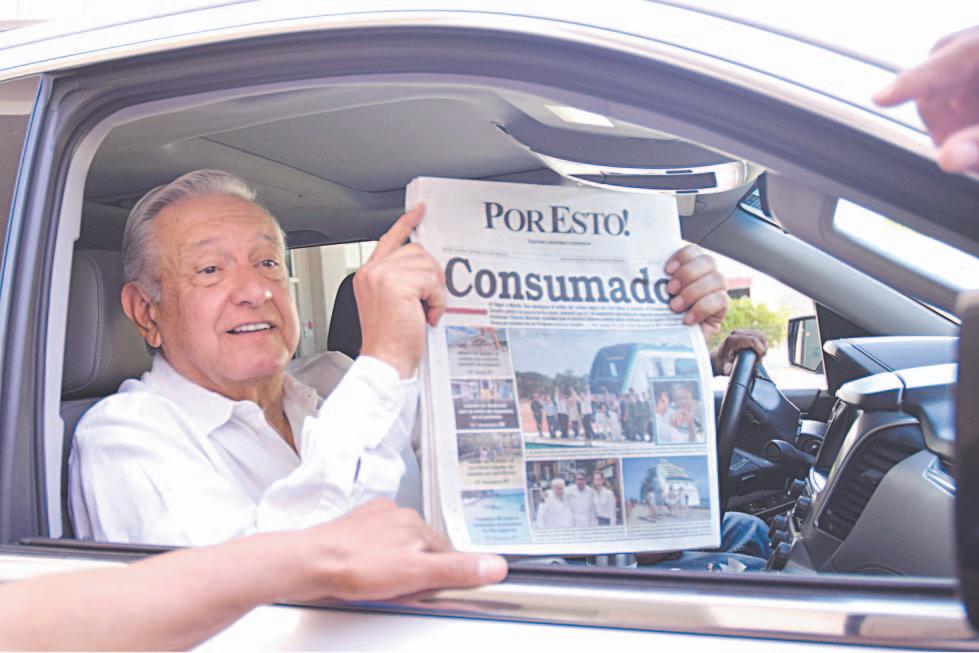 ANTES de reunirse con los responsables de los tramos ferroviarios que se construyen en Yucatán, el Presidente leyó la edición dominical de POR ESTO!, que informó sobre los avances del proyecto que unirá al Sureste. Varias personas acudieron a saludar a López Obrador a su salida del hotel donde pernoctó.- (Diana Várguez)