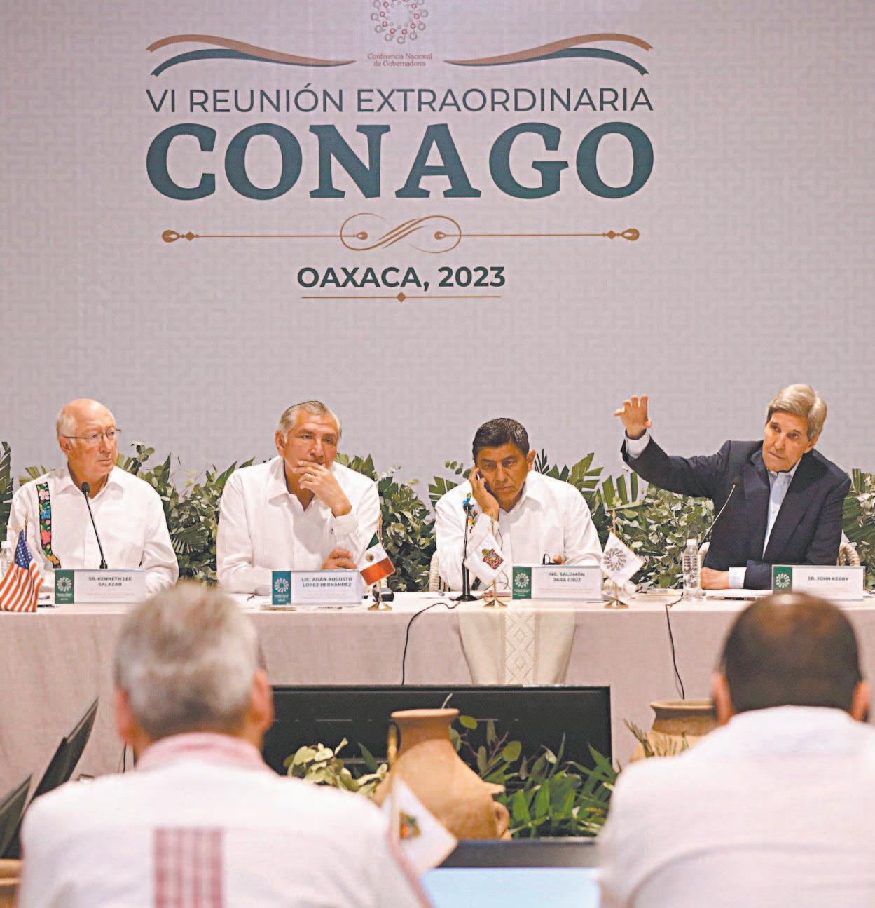 INTEGRANTES de la Conago y el secretario de Gobernación, Adán Augusto López, recibieron en Oaxaca al embajador Ken Salazar y al enviado especial de la Casa Blanca para el clima, John Kerry.- (Cuartoscuro)