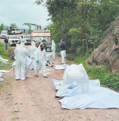 Agentes de la Policía de Investigación y personal de servicios periciales acudieron al tramo carretero Palenque-Benemérito de Las Américas, crucero San Jacinto. Ahí localizaron los cuerpos de tres hombres, dos de ellos identifi cados como Rafael “N” y Delmar “N”. Un tercero que permanece desconocido. (Agencias)