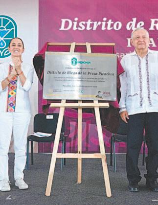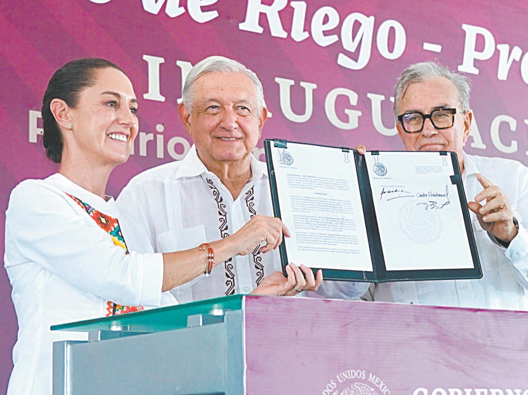 MAZATLÁN, Sin.- Ayer, el presidente López Obrador junto a la presidenta electa, Claudia Sheinbaum y el gobernador de Sinaloa, Rubén Rocha Moya, firmaron el decreto por el que se establece el distrito de riego de la presa Picachos, al tiempo que presenciaron la apertura de uno de los hidrantes que provee agua a productores.