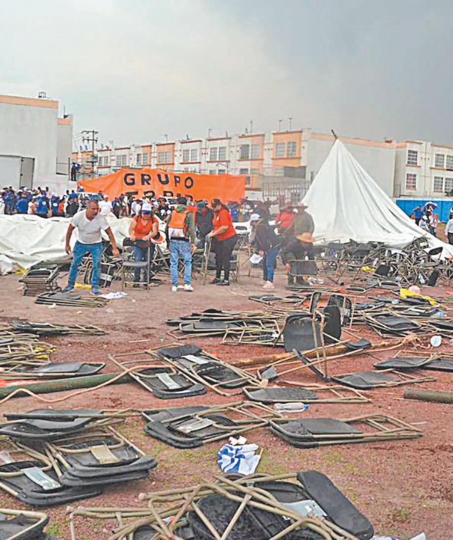 CIUDAD DE MÉXICO.- Durante un mitin de Alejandra del Moral Vela, candidata a la gubernatura del Estado de México, realizado en el municipio de Tecámac, los fuertes vientos provocaron un accidente que alarmó a los simpatizantes que acudieron al evento político para escuchar a la representante de la coalición Va por el Estado de México, formada por del PAN, PRI, PRD y Nueva Alianza, y dejó un saldo de una persona muerta y 26 lesionadas