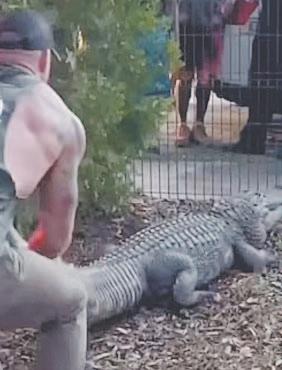 escena de película, el luchador comenzó a llamar la atención del caimán, que abría sus fauces, en espera de poder atacar. El experto en captura tomó al enorme reptil de la cola y lo arrastró a un lugar seguro para atraparlo con un poste de control.