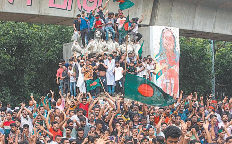festante de 27 años que celebró en las calles capitalinas. Multitudes de personas ondearon banderas y algunos bailaron encima de un tanque el día de ayer, tras más de un mes de violentas protestas en este país de mayoría musulmana, de 171 millones de habitantes, con una economía muy dependiente de la industria textil. Al menos 56 personas murie-