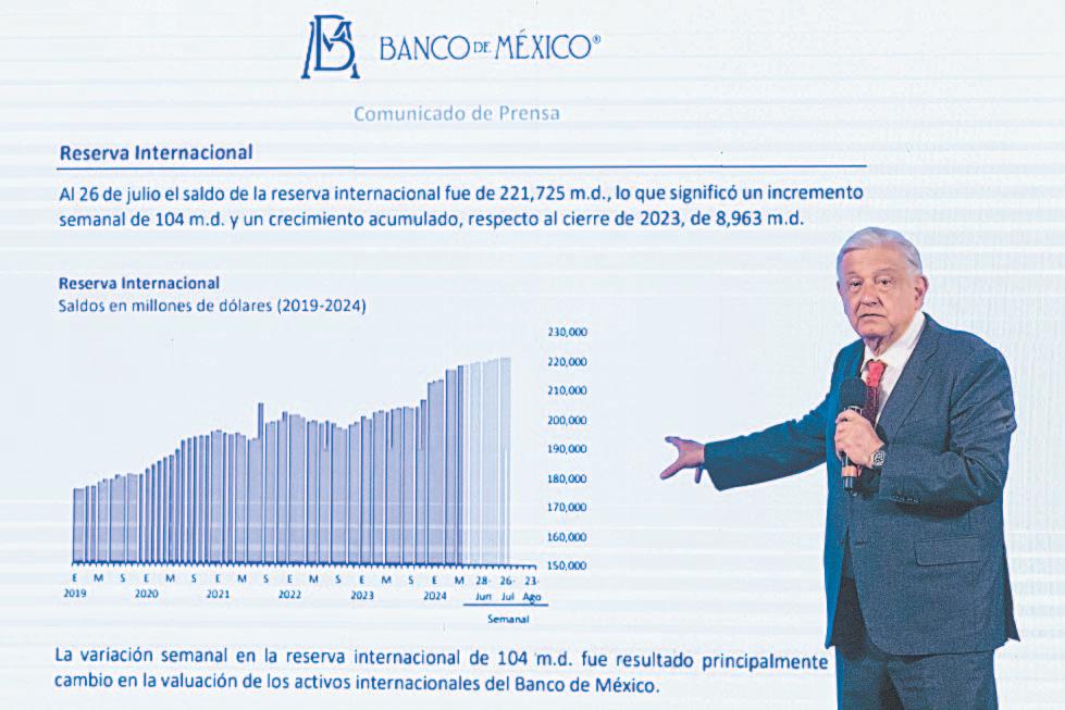 Puntualizó que el Banco de México reportó que el pasado 26 de julio las reservas internacionales alcanzaron un máximo histórico al contabilizar 221 mil 725 millones de dólares, equivalentes a un incremento de 27.6% respecto al 30 de noviembre de 2018, cuando había 173 mil 775 millones de pesos.